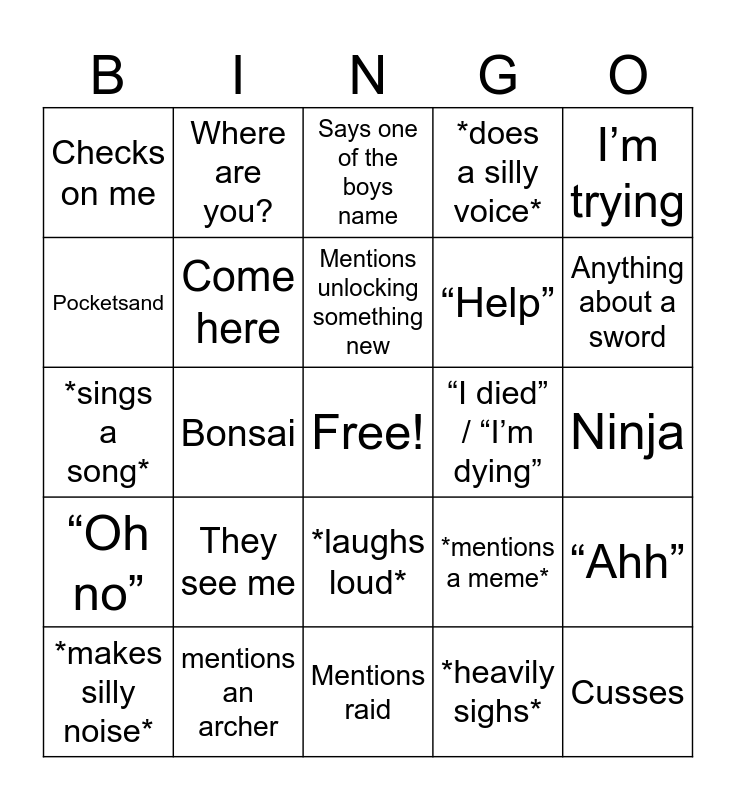 This bingo card has a free space and 24 words: They see me, mentions an archer, Mentions unlocking something new, *makes silly noise*, I’m trying, Checks on me, Pocketsand, Where are you?, “I died” / “I’m dying”, *laughs loud*, “Help”, *sings a song*, *mentions a meme*, “Ahh”, Come here, *heavily sighs*, Ninja, Says one of the boys name, Anything about a sword, Bonsai, Cusses, “Oh no”, *does a silly voice* and Mentions raid.