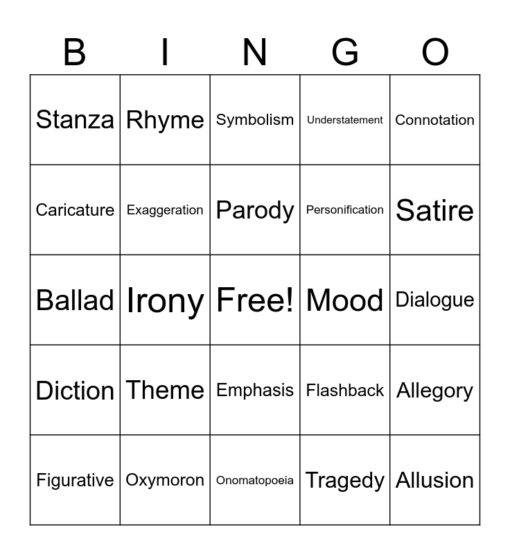 This bingo card has a free space and 36 words: Euphemism, Motif, Simile, Exaggeration, Flashback, Diction, Parody, Wit, Connotation, Resolution, Irony, Understatement, Hyperbole, Mood, Satire, Stanza, Protagonist, Theme, Allusion, Symbolism, Dialogue, Allegory, Oxymoron, Figurative, Onomatopoeia, Rhyme, Ballad, Climax, Personification, Caricature, Idiom, Ambiguity, Tragedy, Emphasis, Cacophony and Soliloquy.