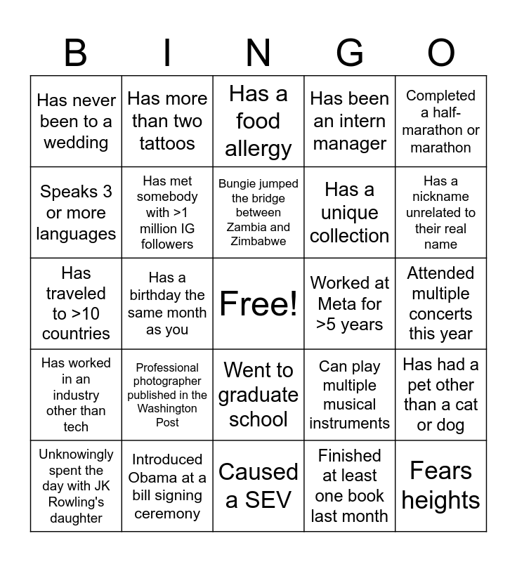 This bingo card has a free space and 24 words: Professional photographer published in the Washington Post, Introduced Obama at a bill signing ceremony, Bungie jumped the bridge between Zambia and Zimbabwe, Unknowingly spent the day with JK Rowling's daughter, Completed a half-marathon or marathon, Has never been to a wedding, Speaks 3 or more languages, Has more than two tattoos, Worked at Meta for >5 years, Went to graduate school, Has a unique collection, Has traveled to >10 countries, Can play multiple musical instruments, Has had a pet other than a cat or dog, Has met somebody with >1 million IG followers, Finished at least one book last month, Attended multiple concerts this year, Has a food allergy, Has a nickname unrelated to their real name, Has a birthday the same month as you, Fears heights, Has worked in an industry other than tech, Has been an intern manager and Caused a SEV.