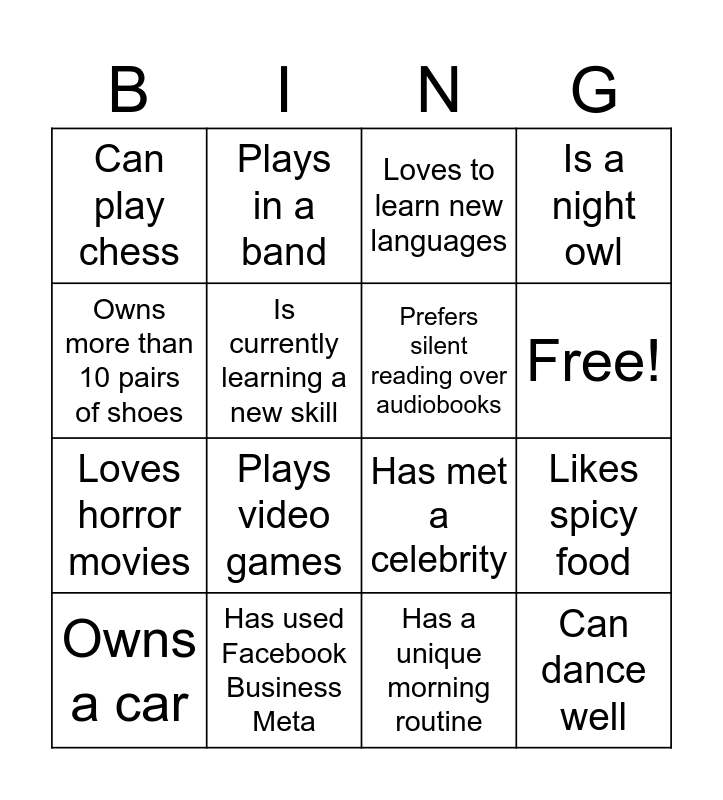 This bingo card has 17 words: Has a unique morning routine, Owns a car, Loves to learn new languages, Can play chess, Plays video games, Is a night owl, Likes spicy food, Prefers silent reading over audiobooks, Free!, Is currently learning a new skill, Has used Facebook Business Meta, Has met a celebrity, Owns more than 10 pairs of shoes, Plays in a band, Loves horror movies, Enjoys writing poetry and Can dance well.