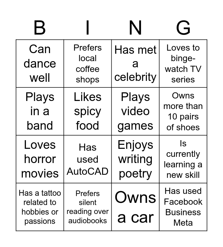 This bingo card has 16 words: Prefers silent reading over audiobooks, Is currently learning a new skill, Has met a celebrity, Can dance well, Loves horror movies, Prefers local coffee shops, Enjoys writing poetry, Owns a car, Plays in a band, Likes spicy food, Has a tattoo related to hobbies or passions, Loves to binge-watch TV series, Has used AutoCAD, Owns more than 10 pairs of shoes, Plays video games and Has used Facebook Business Meta.