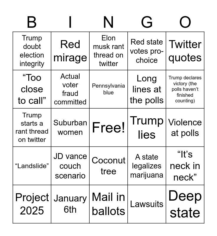 This bingo card has a free space and 24 words: JD vance couch scenario, January 6th, Pennsylvania blue, Project 2025, Twitter quotes, Trump doubt election integrity, “Too close to call”, Red mirage, Trump lies, Coconut tree, Long lines at the polls, Trump starts a rant thread on twitter, A state legalizes marijuana, “It’s neck in neck”, Actual voter fraud committed, Lawsuits, Violence at polls, Elon musk rant thread on twitter, Trump declares victory (the polls haven’t finished counting), Suburban women, Deep state, “Landslide”, Red state votes pro-choice and Mail in ballots.