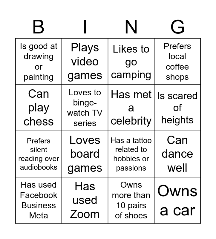 This bingo card has 16 words: Has used Zoom, Can dance well, Likes to go camping, Is good at drawing or painting, Prefers silent reading over audiobooks, Plays video games, Has a tattoo related to hobbies or passions, Owns more than 10 pairs of shoes, Can play chess, Loves to binge-watch TV series, Has used Facebook Business Meta, Prefers local coffee shops, Loves board games, Is scared of heights, Has met a celebrity and Owns a car.