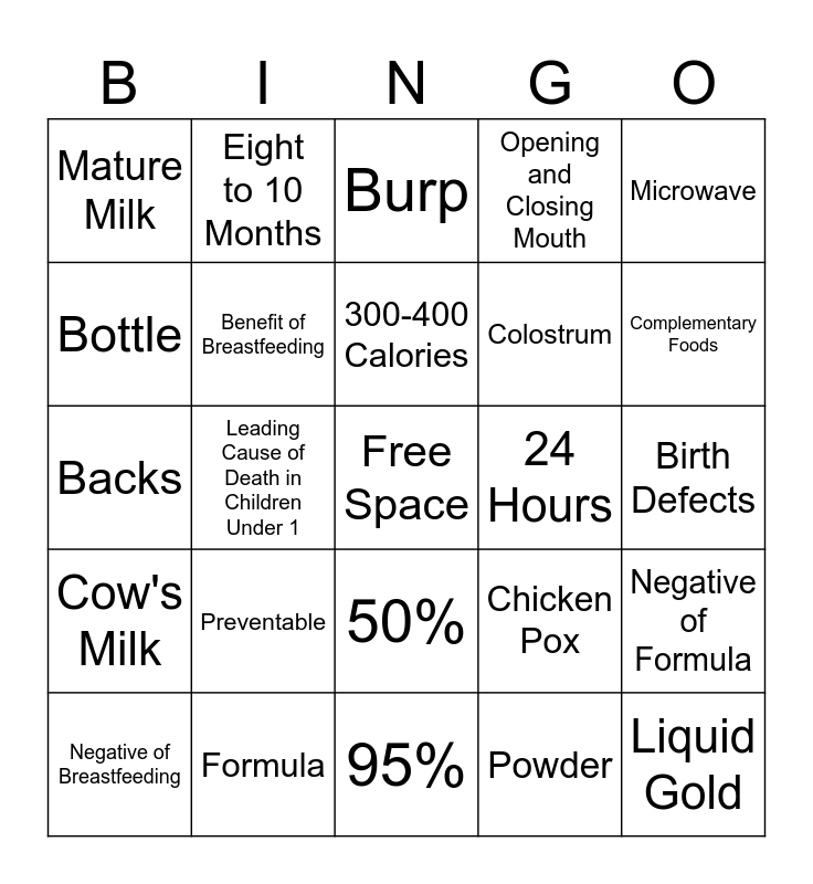 This bingo card has a free space and 59 words: Failure to Thrive, Formula, Breast Milk, Cow's Milk, Powder, Ready to Feed, Benefit of Breastfeeding, Convenient, Colostrum, Antibodies, Opening and Closing Mouth, Transitional Milk, Bottle, Burns Calories, Positive of Formula, Mature Milk, Liquid Gold, Microwave, 45°, 300-400 Calories, 24 Hours, Burp, Negative of Breastfeeding, Negative of Formula, 4 Months, Birth Weight Has Doubled, 15 times, Honey, Complementary Foods, 1 Week, Rice Cereal, Four to Six Months, Six to Eight Months, 10-12 Months, Eight to 10 Months, Beef and Vegetable Puree, SIDS, Leading Cause of Death in Children Under 1, Stomach, Backs, Tummy Time, Preventable, Birth Defects, Smoking, Drinking, and Drugs, Fetal Alcohol Syndrome, Bottle Mouth, Vaccines, 5%, 50%, 95%, Textrue, Free of Distractions, 15, Polio, DTAP, Chicken Pox, Measles, Mumps, Rubella, Spina Bifida and Cleft Lip.