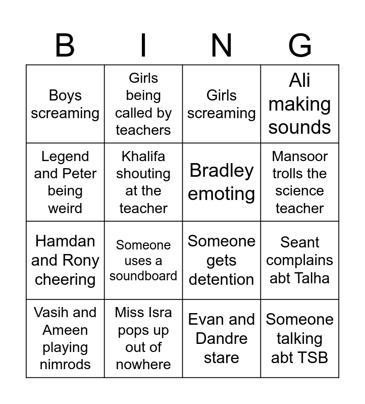 This bingo card has 16 words: Miss Isra pops up out of nowhere, Seant complains abt Talha, Girls screaming, Boys screaming, Hamdan and Rony cheering, Girls being called by teachers, Someone gets detention, Evan and Dandre stare, Legend and Peter being weird, Khalifa shouting at the teacher, Vasih and Ameen playing nimrods, Ali making sounds, Someone uses a soundboard, Mansoor trolls the science teacher, Bradley emoting and Someone talking abt TSB.
