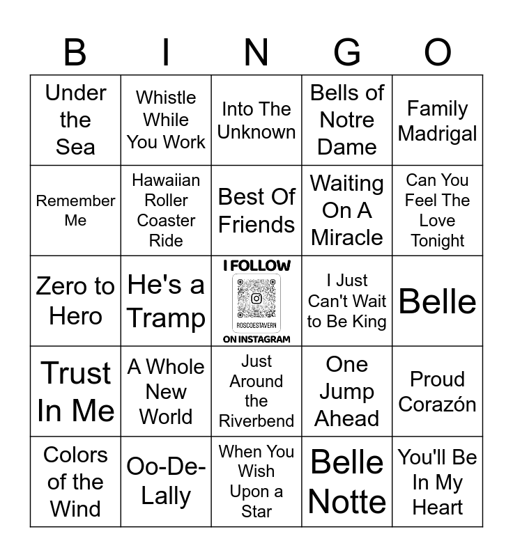 This bingo card has a free space and 60 words: Hakuna Matata, Oo-De-Lally, Candle on the Water, Trust In Me, Belle Notte, Why Should I Worry, Hawaiian Roller Coaster Ride, I'm Late, Waiting On A Miracle, You Got A Friend In Me, Bells of Notre Dame, Cruella De Vil, Remember Me, Winnie the Pooh, Surface Pressure, Under the Sea, You'll Be In My Heart, Family Madrigal, When Will My Life Begin, Best Of Friends, I Just Can't Wait to Be King, Into The Unknown, Colors of the Wind, Proud Corazón, Daughters of Triton, Poor Unfortunate Souls, Two Worlds, God Help the Outcasts, Can You Feel The Love Tonight, Following the Leader, Dig A Little Deeper, In Summer, Feed the Birds, Hi Diddle Dee Dee, Whistle While You Work, Reflection, You're Welcome, He's a Tramp, The Work Song, Zero to Hero, Painting the Roses Red, A Whole New World, Belle, I Got No Strings, One Jump Ahead, He Mele No Lilo, Les Poisson, This Wish, Nobody Like You, Just Around the Riverbend, When You Wish Upon a Star, I Won't Say I'm in Love, Heigh-Ho, Try Everything, In A World Of My Own, A Pirate's Life, Friend Like Me, Friends on the Other Side, Can I Get a Chee Hoo? and Get Lost.