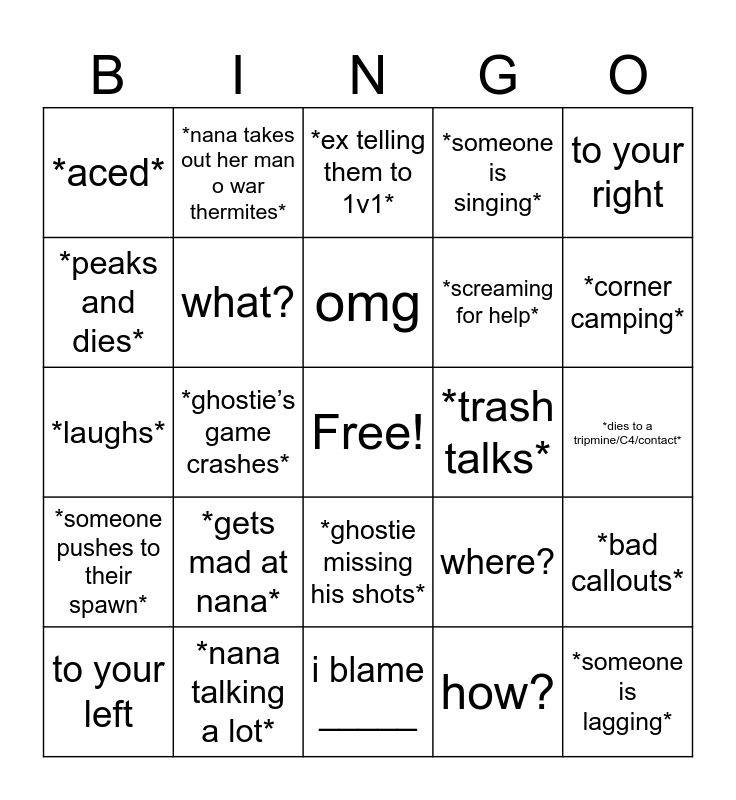 This bingo card has a free space and 24 words: *gets mad at nana*, *nana talking a lot*, omg, to your left, to your right, *aced*, *peaks and dies*, *nana takes out her man o war thermites*, *trash talks*, *ghostie missing his shots*, *screaming for help*, *laughs*, where?, *bad callouts*, what?, how?, *dies to a tripmine/C4/contact*, *ex telling them to 1v1*, *corner camping*, *ghostie’s game crashes*, *someone is lagging*, *someone pushes to their spawn*, *someone is singing* and i blame _____.