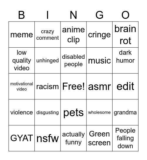 This bingo card has a free space and 24 words: disgusting, nsfw, disabled people, GYAT, brain rot, meme, low quality video, crazy comment, asmr, pets, music, motivational video, wholesome, grandma, unhinged, Green screen, edit, anime clip, dark humor, racism, People falling down, violence, cringe and actually funny.