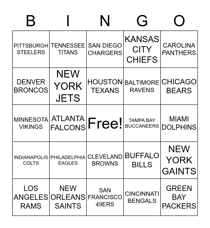 This bingo card has a free space and 24 words: PHILADELPHIA EAGLES, NEW ORLEANS SAINTS, HOUSTON TEXANS, LOS ANGELES RAMS, CAROLINA PANTHERS, PITTSBURGH STEELERS, DENVER BRONCOS, TENNESSEE TITANS, TAMPA BAY BUCCANEERS, CLEVELAND BROWNS, BALTIMORE RAVENS, MINNESOTA VIKINGS, BUFFALO BILLS, NEW YORK GAINTS, NEW YORK JETS, CINCINNATI BENGALS, MIAMI DOLPHINS, SAN DIEGO CHARGERS, CHICAGO BEARS, ATLANTA FALCONS, GREEN BAY PACKERS, INDIANAPOLIS COLTS, KANSAS CITY CHIEFS and SAN FRANCISCO 49ERS.