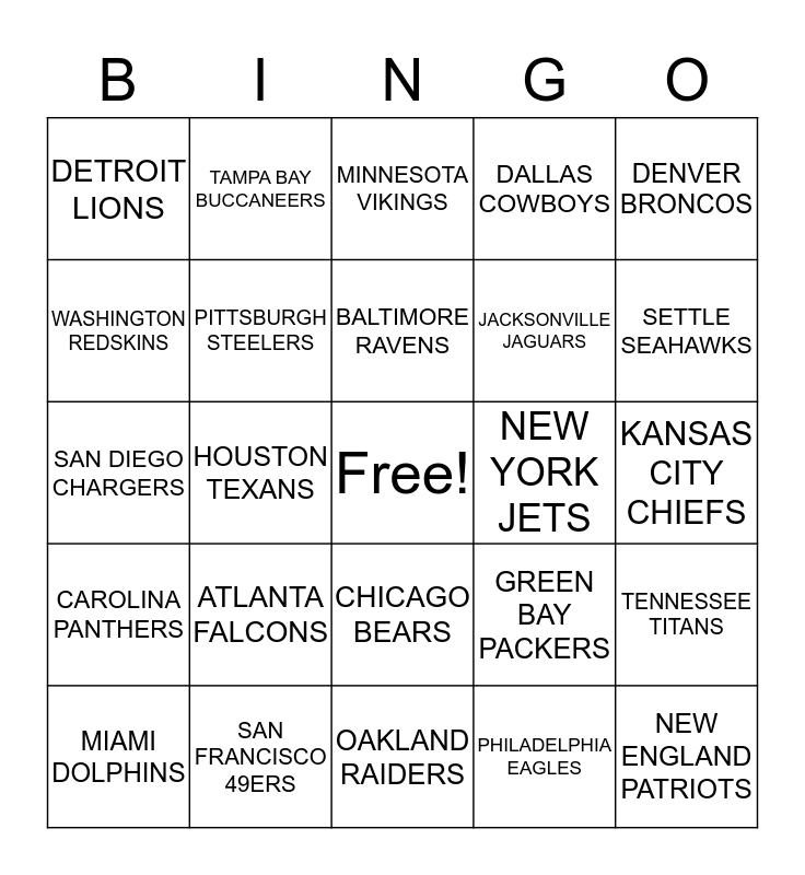 This bingo card has a free space and 32 words: PHILADELPHIA EAGLES, NEW ORLEANS SAINTS, HOUSTON TEXANS, LOS ANGELES RAMS, CAROLINA PANTHERS, PITTSBURGH STEELERS, DENVER BRONCOS, TENNESSEE TITANS, TAMPA BAY BUCCANEERS, CLEVELAND BROWNS, BALTIMORE RAVENS, MINNESOTA VIKINGS, BUFFALO BILLS, NEW YORK GAINTS, NEW YORK JETS, CINCINNATI BENGALS, MIAMI DOLPHINS, SAN DIEGO CHARGERS, CHICAGO BEARS, ATLANTA FALCONS, GREEN BAY PACKERS, INDIANAPOLIS COLTS, KANSAS CITY CHIEFS, SAN FRANCISCO 49ERS, NEW ENGLAND PATRIOTS, DALLAS COWBOYS, JACKSONVILLE JAGUARS, WASHINGTON REDSKINS, DETROIT LIONS, OAKLAND RAIDERS, ARIZONA CARDINALS and SETTLE SEAHAWKS.