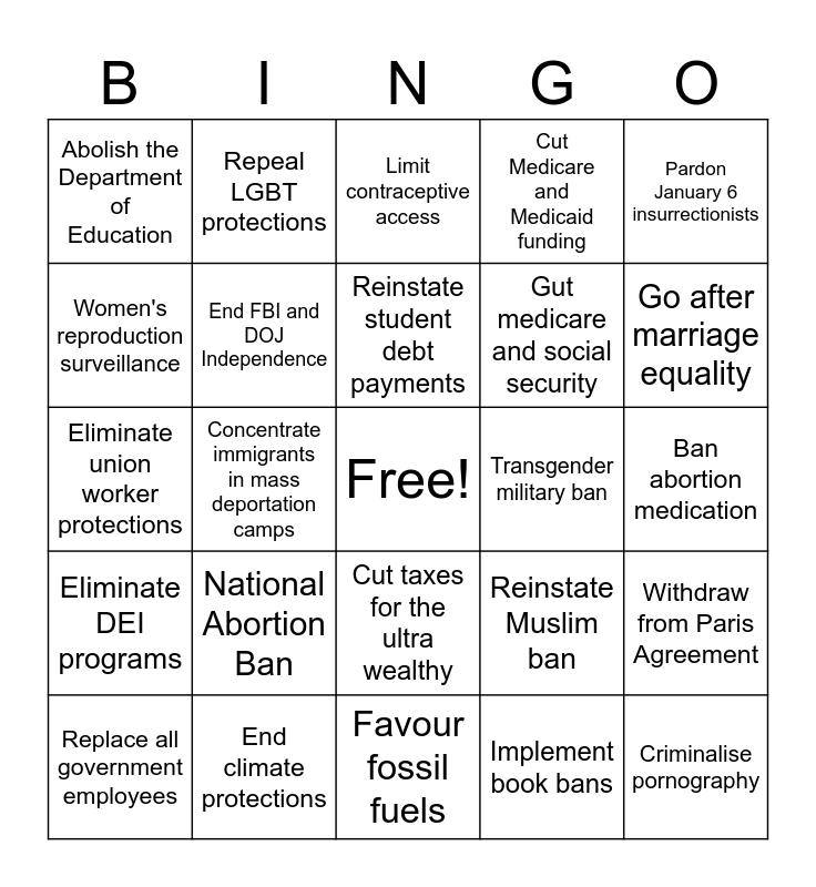 This bingo card has a free space and 24 words: National Abortion Ban, End climate protections, Reinstate student debt payments, Replace all government employees, Pardon January 6 insurrectionists, Abolish the Department of Education, Women's reproduction surveillance, Repeal LGBT protections, Transgender military ban, Cut taxes for the ultra wealthy, Gut medicare and social security, Eliminate union worker protections, Reinstate Muslim ban, Withdraw from Paris Agreement, End FBI and DOJ Independence, Implement book bans, Ban abortion medication, Limit contraceptive access, Go after marriage equality, Concentrate immigrants in mass deportation camps, Criminalise pornography, Eliminate DEI programs, Cut Medicare and Medicaid funding and Favour fossil fuels.
