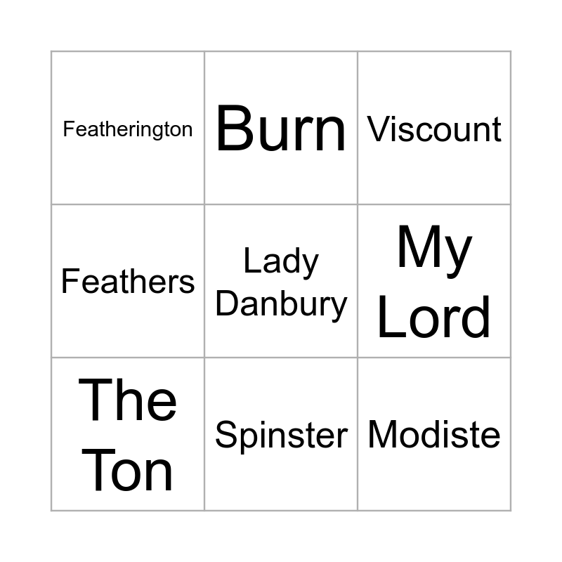 This bingo card has 50 words: Rake, Wallflower, Diamond, Her Majesty, Scandal, Chaperone, Burn, Dance Card, My Lord, Your Grace, The Ton, Feathers, Swoon, Promenade, Gentle Reader, Whistle Down, Spinster, Debutante, Mammas, Lady Danbury, The Queen, The Duke, Featherington, Modiste, Carriage, Afternoon Tea, Coming Out, Ruined, Viscount, Trousseau, Society, Ball, Orchestra, Dearest, Bridgerton, Flawless, Gentlemen, Season, Duchess, Pianoforte, Virtue, Painting, Siblings, Newspaper, Facer, Lovematch, Dowry, Heir, Countess and Netflix.
