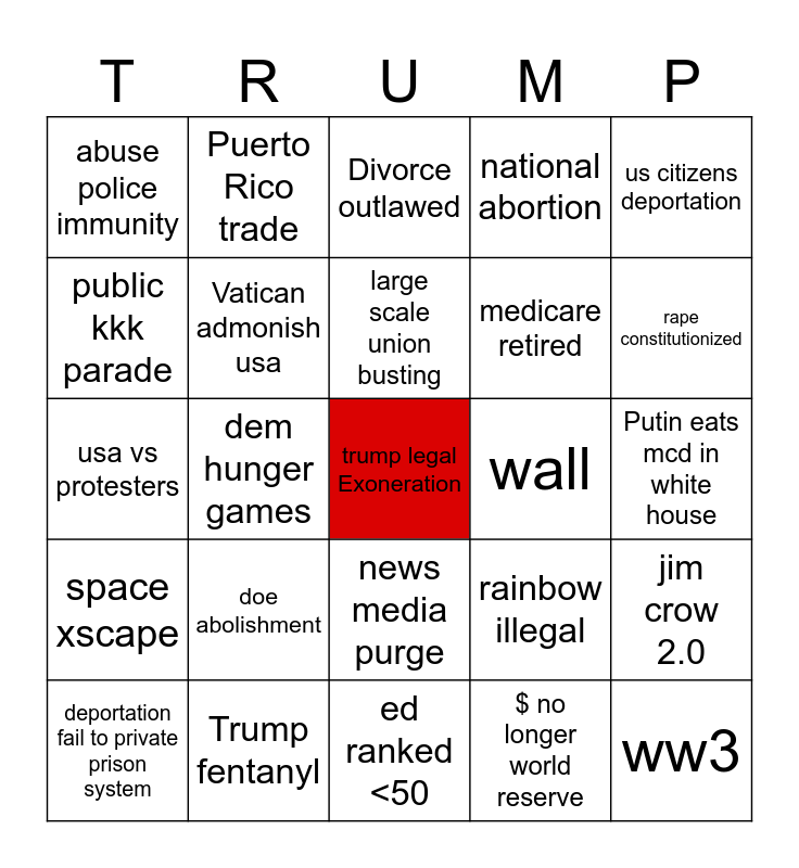 This bingo card has a free space and 24 words: doe abolishment, Trump fentanyl, large scale union busting, deportation fail to private prison system, us citizens deportation, abuse police immunity, public kkk parade, Puerto Rico trade, wall, news media purge, medicare retired, usa vs protesters, rainbow illegal, jim crow 2.0, Vatican admonish usa, $ no longer world reserve, Putin eats mcd in white house, Divorce outlawed, rape constitutionized, dem hunger games, ww3, space xscape, national abortion and ed ranked <50.