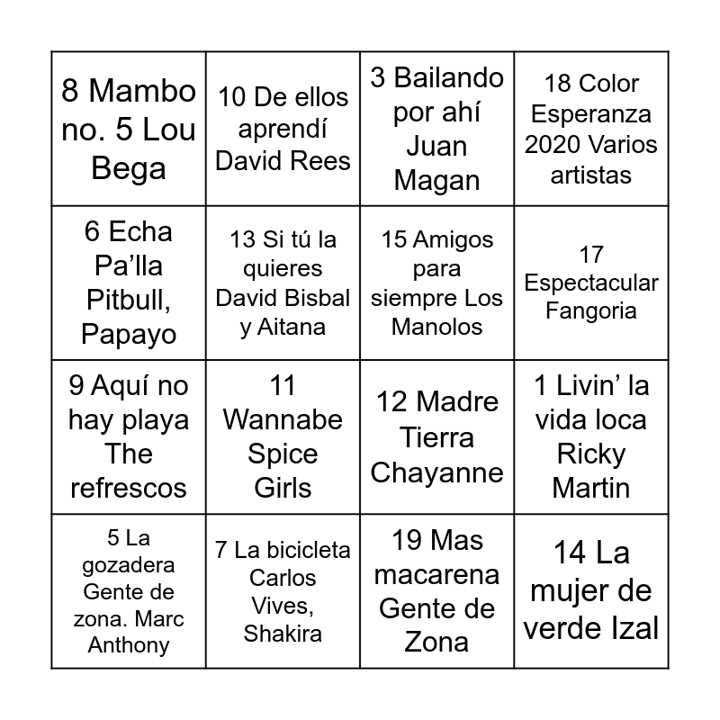 This bingo card has 20 words: 1 Livin’ la vida loca Ricky Martin, 2 La bilirrubina Juan Luis Guerra, 3 Bailando por ahí Juan Magan, 4 Conga Gloria Estefan, 5 La gozadera Gente de zona. Marc Anthony, 6 Echa Pa’lla Pitbull, Papayo, 7 La bicicleta Carlos Vives, Shakira, 8 Mambo no. 5 Lou Bega, 9 Aquí no hay playa The refrescos, 10 De ellos aprendí David Rees, 11 Wannabe Spice Girls, 12 Madre Tierra Chayanne, 13 Si tú la quieres David Bisbal y Aitana, 14 La mujer de verde Izal, 15 Amigos para siempre Los Manolos, 16 Swish Swish Katy Perry, 17 Espectacular Fangoria, 18 Color Esperanza 2020 Varios artistas, 19 Mas macarena Gente de Zona and 20 Levantando las manos El Símbolo.