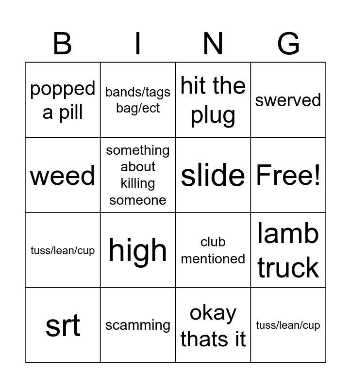 This bingo card has 17 words: okay thats it, srt, hit the plug, popped a pill, high, swerved, lamb truck, slide, Free!, something about killing someone, scamming, club mentioned, weed, bands/tags bag/ect, tuss/lean/cup, gat/stick/pole/pipe and tuss/lean/cup.