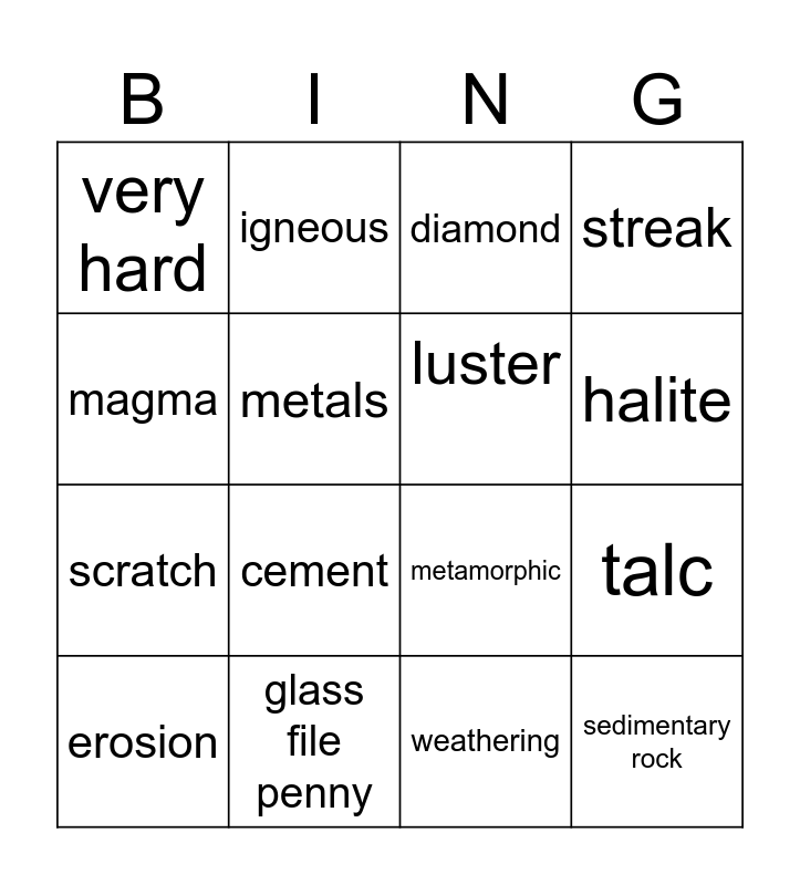 This bingo card has 22 words: glass file penny, extremely soft, igneous, rock cycle, metals, luster, very hard, diamond, metamorphic, sedimentary rock, scratch, streak, sediment, cleavage/fracture, weathering, hardness, talc, erosion, cement, magma, halite and extrusive rock.