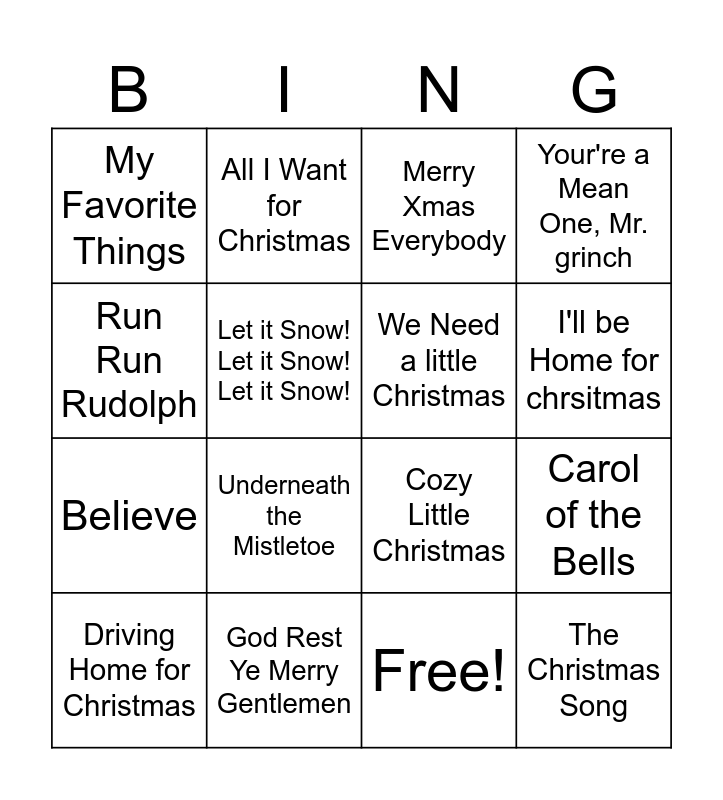 This bingo card has 17 words: Free!, Driving Home for Christmas, Merry Xmas Everybody, My Favorite Things, Underneath the Mistletoe, Your're a Mean One, Mr. grinch, Carol of the Bells, We Need a little Christmas, I'll be Home for chrsitmas, Let it Snow! Let it Snow! Let it Snow!, God Rest Ye Merry Gentlemen, Cozy Little Christmas, Run Run Rudolph, All I Want for Christmas, Believe, Silent Night and The Christmas Song.
