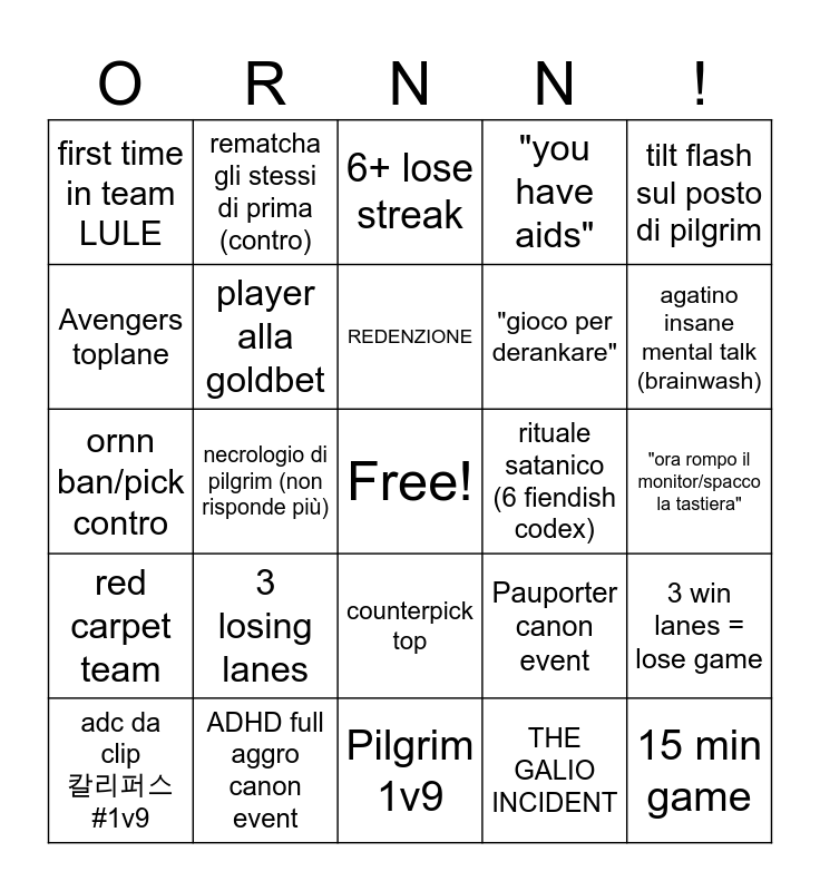 This bingo card has a free space and 24 words: 3 losing lanes, ADHD full aggro canon event, REDENZIONE, adc da clip 칼리퍼스 #1v9, tilt flash sul posto di pilgrim, first time in team LULE, Avengers toplane, rematcha gli stessi di prima (contro), rituale satanico (6 fiendish codex), counterpick top, "gioco per derankare", ornn ban/pick contro, Pauporter canon event, 3 win lanes = lose game, player alla goldbet, THE GALIO INCIDENT, "ora rompo il monitor/spacco la tastiera", 6+ lose streak, agatino insane mental talk (brainwash), necrologio di pilgrim (non risponde più), 15 min game, red carpet team, "you have aids" and Pilgrim 1v9.
