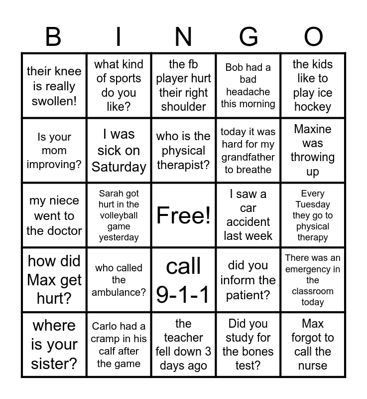 This bingo card has a free space and 29 words: where is your sister?, remember to use your seatbelt, Sarah got hurt in the volleyball game yesterday, Did you aunt finish her exercises?, their knee is really swollen!, the fb player hurt their right shoulder, I was sick on Saturday, who called the ambulance?, I saw a car accident last week, Carlo had a cramp in his calf after the game, Every Tuesday they go to physical therapy, Max forgot to call the nurse, the teacher fell down 3 days ago, Did you study for the bones test?, Maxine was throwing up, how does you father feel today?, call 9-1-1, how did Max get hurt?, the kids like to play ice hockey, my niece went to the doctor, did you inform the patient?, is COVID a disease?, today it was hard for my grandfather to breathe, Is your mom improving?, Bob had a bad headache this morning, what kind of sports do you like?, There was an emergency in the classroom today, who is the physical therapist? and how many times have you gone to the hospital?.