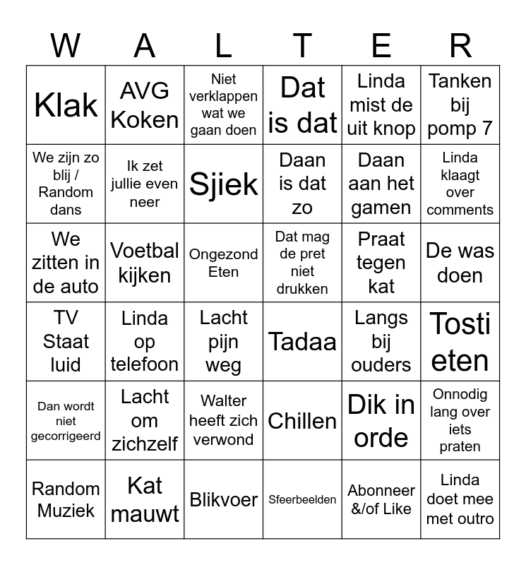 This bingo card has 36 words: TV Staat luid, Linda op telefoon, Blikvoer, Daan is dat zo, Praat tegen kat, De was doen, Klak, Kat mauwt, Niet verklappen wat we gaan doen, Chillen, Daan aan het gamen, Tanken bij pomp 7, Dan wordt niet gecorrigeerd, Voetbal kijken, Sjiek, Dat is dat, Dik in orde, Tosti eten, We zijn zo blij / Random dans, Ik zet jullie even neer, Lacht pijn weg, Tadaa, Langs bij ouders, Onnodig lang over iets praten, We zitten in de auto, AVG Koken, Ongezond Eten, Sfeerbeelden, Linda mist de uit knop, Linda klaagt over comments, Random Muziek, Lacht om zichzelf, Walter heeft zich verwond, Dat mag de pret niet drukken, Abonneer &/of Like and Linda doet mee met outro.