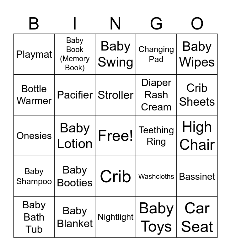 This bingo card has a free space and 40 words: Diapers, Onesies, Baby Bottles, Pacifier, Baby Blanket, Crib, Stroller, Diaper Bag, Baby Wipes, Baby Shampoo, Baby Lotion, Changing Pad, Car Seat, High Chair, Teething Ring, Baby Booties, Baby Monitor, Playmat, Swaddle Blanket, Baby Swing, Bassinet, Baby Toys, Diaper Rash Cream, Bottle Warmer, Baby Clothes Hangers, Baby Mittens, Sleep Sack, Baby Carrier, Bouncer Seat, Breast Pump, Nursing Pillow, Baby Bath Tub, Baby Towels, Washcloths, Crib Sheets, Nightlight, Baby First Aid Kit, Pacifier Clips, Baby Book (Memory Book) and Baby Shoes.