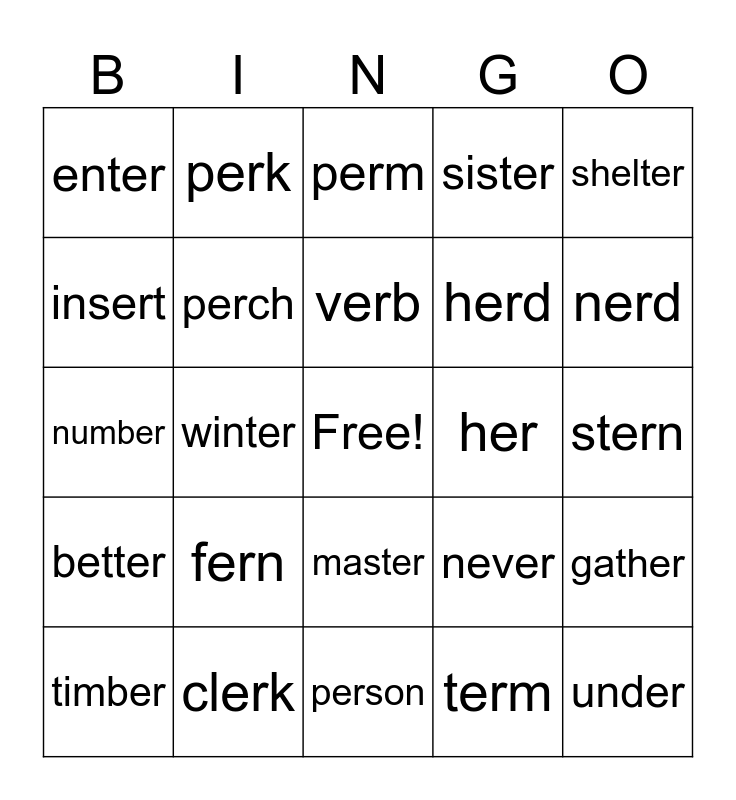 This bingo card has a free space and 24 words: fern, clerk, verb, timber, shelter, enter, insert, perk, her, master, herd, number, never, gather, perch, term, stern, perm, nerd, winter, under, better, sister and person.