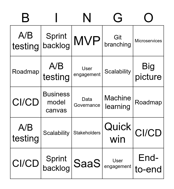 This bingo card has 77 words: Agile, Scrum, MVP, KPI, ROI, Data-driven decision making, Quick win, Big picture, Scalability, Pipeline, End-to-end, Business-to-business, User engagement, Roadmap, Value proposition, Business model canvas, Machine learning, Data Governance, Frictionless journey, Microservices, DevOps, CI/CD, A/B testing, Sprint backlog, Git branching, SaaS, Stakeholders, Agile, out-of-the-box, MVP, KPI, ROI, Data-driven decision making, Quick win, Big picture, Scalability, Pipeline, Business-to-business, Roadmap, User engagement, Value proposition, Business model canvas, Machine learning, Data Governance, Frictionless journey, DevOps, CI/CD, A/B testing, Sprint backlog, Git branching, SaaS, Stakeholders, Agile, out-of-the-box, MVP, KPI, ROI, Data-driven decision making, Quick win, Big picture, Scalability, Pipeline, Business-to-business, Roadmap, User engagement, Value proposition, Business model canvas, Machine learning, Data Governance, Frictionless journey, DevOps, CI/CD, A/B testing, Sprint backlog, Git branching, SaaS and Stakeholders.