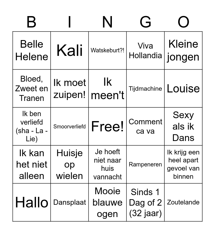 This bingo card has a free space and 51 words: L.O.V.E., Zoutelande, Mannenharten, Mooie blauwe ogen, Huisje op wielen, Jij krijgt die lach niet van mijn gezicht, Kali, Uit M'n Bol, Bloed, Zweet en Tranen, C'est la vie, Ik moet zuipen!, Viva Hollandia, Ik krijg een heel apart gevoel van binnen, Rampeneren, Daar moet een piemel in, Bon gepakt, Ik meen't, Comment ca va, Het regent zonnestralen, Kleine jongen, Smoorverliefd, Sinds 1 Dag of 2 (32 jaar), Belle Helene, Tijdmachine, Hoe, Rosanne, Louise, Sterrenstof, Hallo, Watskeburt?!, Noodgeval, Hans betaalt de schade, Een beetje verliefd, Ademnood, Vlinders, Dansplaat, Bagagedrager, Wat zou je doen?, Even aan mijn moeder vragen, Dominique, Sexy als ik Dans, Ik kan het niet alleen, Stil in mij, Echte liefde, Toppertje!, Mooie dag, Ik ben verliefd (sha - La - Lie), Ik voel me zo Verdomd alleen, Rood, Je hoeft niet naar huis vannacht and Van Goes tot Purmerend.