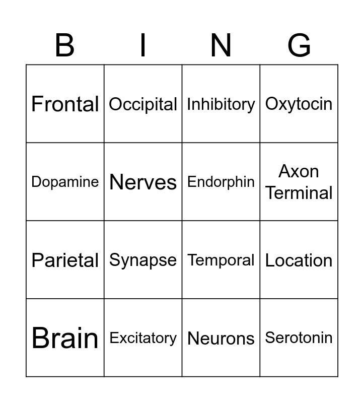 This bingo card has 16 words: Excitatory, Location, Inhibitory, Frontal, Parietal, Occipital, Temporal, Neurons, Dopamine, Nerves, Brain, Oxytocin, Synapse, Axon Terminal, Endorphin and Serotonin.