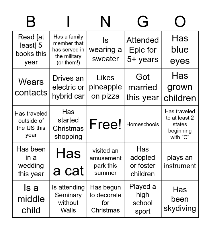 This bingo card has a free space and 39 words: Has grandchildren, Is a business owner, Drove here TODAY, Drives an electric or hybrid car, Is a middle child, visited an amusement park this summer, Likes pineapple on pizza, has the same birth month as you, Has blue eyes, Has been in a wedding this year, Has started Christmas shopping, Attended Epic for 5+ years, Has been skydiving, Has traveled to at least 2 states beginning with "C", Homeschools, Has a cat, Has run or walked a race, Read [at least] 5 books this year, Made your family meals for the weekend before you left, Has adopted or foster children, Wears contacts, Has begun to decorate for Christmas, Got married this year, Has grown children, Is left handed, Is wearing slip-on shoes, Has no children, Born outside of MD, Does not drink coffee, Has a family member that has served in the military (or them!), baked something in the last month, Has 4+ children, Is wearing a sweater, Is attending Seminary without Walls, Played a high school sport, Listens to podcasts, plays an instrument, Has traveled outside of the US this year and Has been on a mission trip.