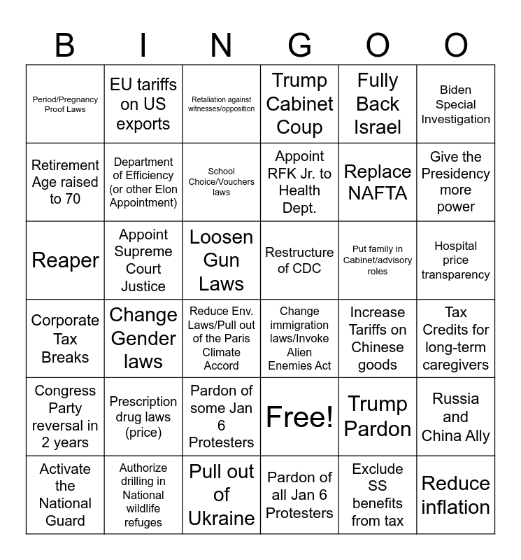 This bingo card has 36 words: Free!, Pardon of some Jan 6 Protesters, Pardon of all Jan 6 Protesters, Retirement Age raised to 70, Corporate Tax Breaks, Restructure of CDC, Department of Efficiency (or other Elon Appointment), Pull out of Ukraine, Fully Back Israel, Trump Pardon, Give the Presidency more power, Trump Cabinet Coup, Russia and China Ally, Appoint Supreme Court Justice, Appoint RFK Jr. to Health Dept., Period/Pregnancy Proof Laws, Congress Party reversal in 2 years, Put family in Cabinet/advisory roles, Reaper, Retaliation against witnesses/opposition, Loosen Gun Laws, Change Gender laws, Change immigration laws/Invoke Alien Enemies Act, Reduce Env. Laws/Pull out of the Paris Climate Accord, Increase Tariffs on Chinese goods, EU tariffs on US exports, Replace NAFTA, Authorize drilling in National wildlife refuges, School Choice/Vouchers laws, Biden Special Investigation, Reduce inflation, Activate the National Guard, Tax Credits for long-term caregivers, Hospital price transparency, Prescription drug laws (price) and Exclude SS benefits from tax.