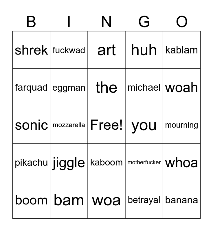 This bingo card has a free space and 24 words: jiggle, bam, the, boom, kablam, shrek, farquad, fuckwad, you, kaboom, michael, sonic, motherfucker, whoa, eggman, betrayal, mourning, art, woah, mozzarella, banana, pikachu, huh and woa.