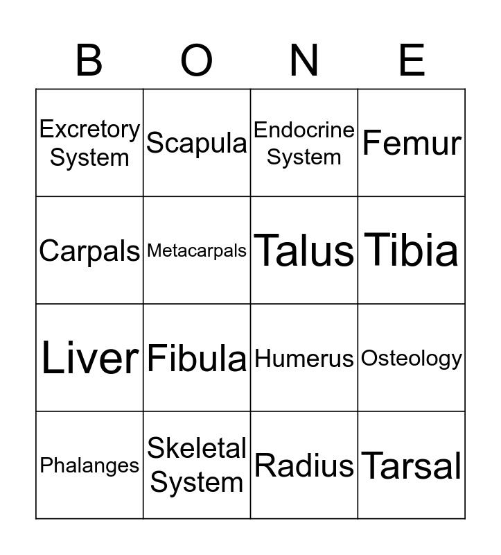 This bingo card has 16 words: Skeletal System, Osteology, Endocrine System, Excretory System, Liver, Scapula, Humerus, Radius, Carpals, Metacarpals, Phalanges, Femur, Fibula, Tibia, Talus and Tarsal.