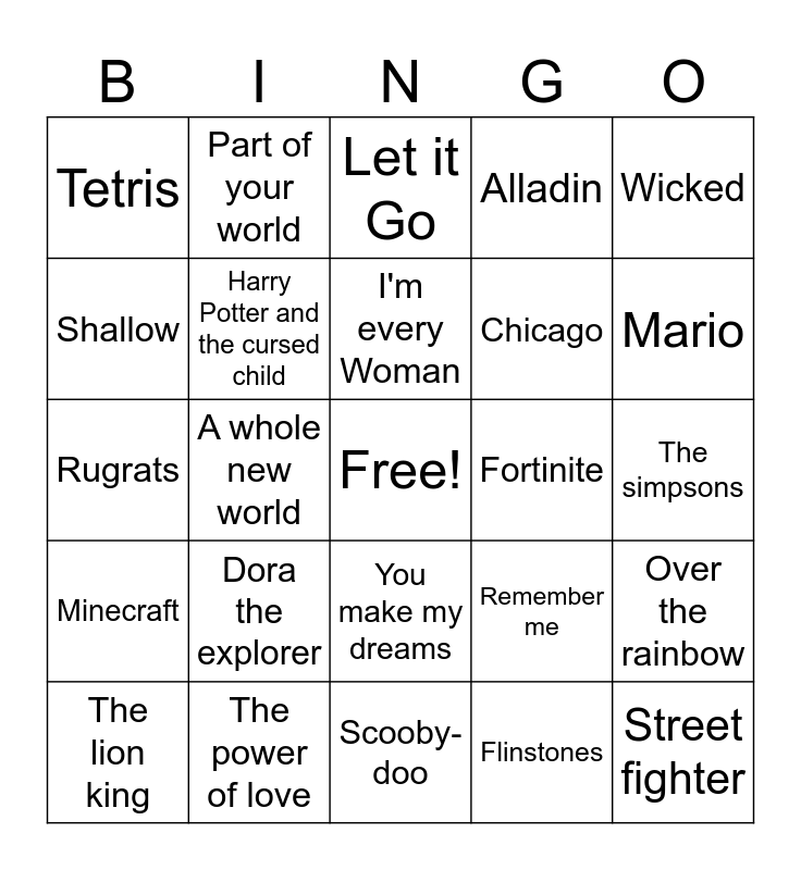 This bingo card has a free space and 24 words: The lion king, Dora the explorer, I'm every Woman, Flinstones, Wicked, Tetris, Part of your world, Let it Go, Fortinite, The simpsons, Rugrats, Harry Potter and the cursed child, Remember me, Over the rainbow, Shallow, The power of love, Scooby-doo, Alladin, Mario, Minecraft, A whole new world, You make my dreams, Chicago and Street fighter.