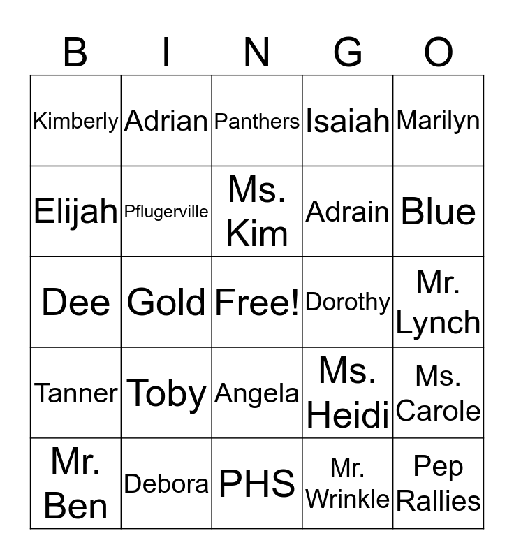 This bingo card has a free space and 24 words: Toby, Debora, Ms. Kim, Mr. Ben, Marilyn, Kimberly, Elijah, Adrian, Dorothy, Angela, Adrain, Dee, Ms. Heidi, Ms. Carole, Pflugerville, Mr. Wrinkle, Mr. Lynch, Panthers, Blue, Gold, Pep Rallies, Tanner, Isaiah and PHS.