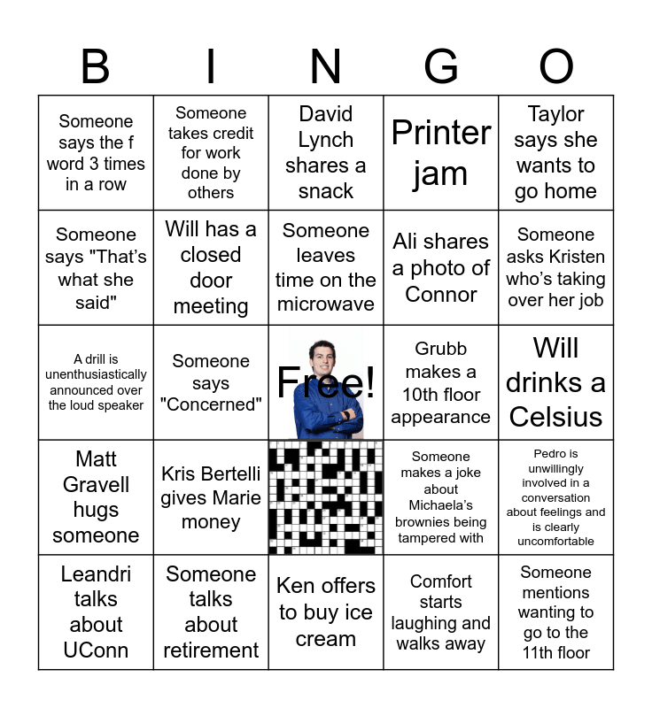 This bingo card has 1 images, a free space and 25 words: Comfort starts laughing and walks away, Someone leaves time on the microwave, Someone talks about retirement, Taylor says she wants to go home, Someone says the f word 3 times in a row, Someone says "That’s what she said", Someone takes credit for work done by others, Will drinks a Celsius, Someone makes a joke about Michaela’s brownies being tampered with, Ali shares a photo of Connor, A drill is unenthusiastically announced over the loud speaker, Pedro is unwillingly involved in a conversation about feelings and is clearly uncomfortable, Leandri talks about UConn, Someone says "Concerned", Someone uses the pencil sharpener, Printer jam, Matt Gravell hugs someone, David Lynch shares a snack, Someone mentions wanting to go to the 11th floor, Someone asks Kristen who’s taking over her job, Ken offers to buy ice cream, Grubb makes a 10th floor appearance, Kris Bertelli gives Marie money, Will has a closed door meeting and Someone mentions Tal.