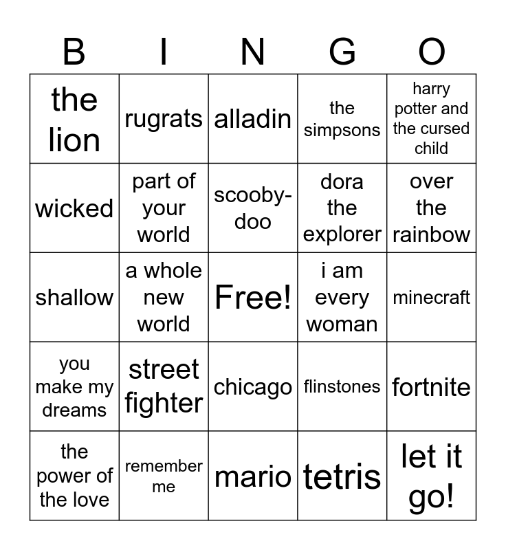 This bingo card has a free space and 24 words: street fighter, remember me, scooby-doo, the power of the love, harry potter and the cursed child, the lion, wicked, rugrats, i am every woman, chicago, dora the explorer, shallow, flinstones, fortnite, part of your world, tetris, minecraft, alladin, over the rainbow, a whole new world, let it go!, you make my dreams, the simpsons and mario.