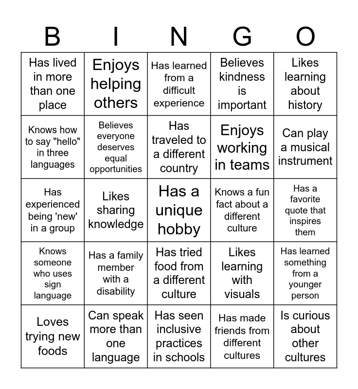This bingo card has a free space and 24 words: Has a family member with a disability, Can speak more than one language, Has traveled to a different country, Loves trying new foods, Likes learning about history, Has lived in more than one place, Knows how to say "hello" in three languages, Enjoys helping others, Knows a fun fact about a different culture, Has tried food from a different culture, Enjoys working in teams, Has experienced being 'new' in a group, Likes learning with visuals, Has learned something from a younger person, Believes everyone deserves equal opportunities, Has made friends from different cultures, Has a favorite quote that inspires them, Has learned from a difficult experience, Can play a musical instrument, Likes sharing knowledge, Is curious about other cultures, Knows someone who uses sign language, Believes kindness is important and Has seen inclusive practices in schools.