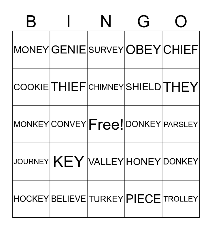 This bingo card has a free space and 24 words: KEY, BELIEVE, CHIMNEY, HOCKEY, CHIEF, MONEY, COOKIE, GENIE, DONKEY, VALLEY, SHIELD, MONKEY, HONEY, DONKEY, THIEF, PIECE, PARSLEY, SURVEY, THEY, CONVEY, TROLLEY, JOURNEY, OBEY and TURKEY.
