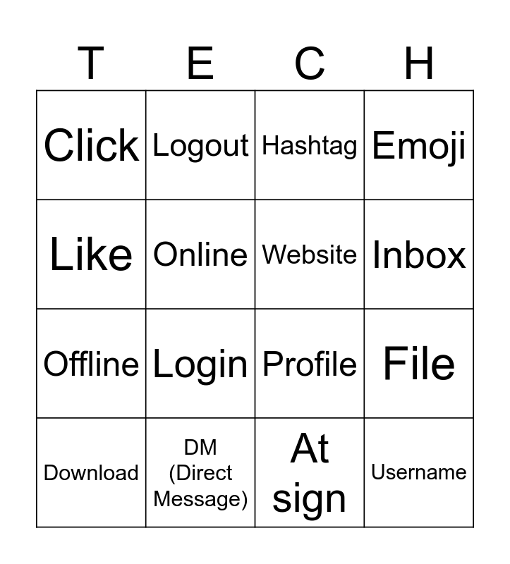 This bingo card has 44 words: Wi-Fi, Download, Upload, Link, Streaming, Cookie, Hashtag, Post, Like, Follower, Emoji, DM (Direct Message), Share, Feed, Notification, Story, Viral, Profile, Influencer, Login, Logout, Subscribe, Scroll, Click, Keyboard, At sign, Password, Pop-up, Spam, Username, Attachment, Desktop, E-book, E-mail address, File, Hardware, Software, Icon, Inbox, Online, Offline, Printer, Website and World Wide Web.