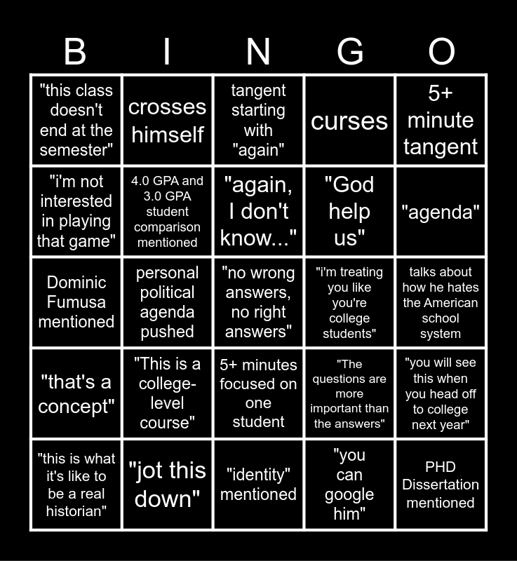 This bingo card has 54 words: Free!, "that's a concept", "etc... etc", "phones silenced and in a backpack", 5+ minutes focused on one student, mentions sicilian-catholic background, curses, "I don't know the answers to my own questions", "i'm not interested in playing that game", "i'm not disagreeing with you", "this class doesn't end at the semester", "not because it's gonna be on the test", "jot this down", "this is what it's like to be a real historian", bashes park tudor, "identity" mentioned, "no wrong answers, no right answers", "God help us", wearing college polo/jacket, talks about how he hates the American school system, "The questions are more important than the answers", "cisgendered, heterosexual, white male", "i'm treating you like you're college students", 5+ minute tangent, "did you study ____ in apush?", crosses himself, walks from one side of the lecture hall to the other, Charlie Bolton mentioned, George Hornedo mentioned, "you can google him", student email, "I'm overqualified for this job", IU music school mentioned, "juvenile", tangent starting with "again", gigatangent (10+ minutes off the main topic), Dominic Fumusa mentioned, "you will see this when you head off to college next year", PHD Dissertation mentioned, 4.0 GPA and 3.0 GPA student comparison mentioned, "i've been in highschool for 25 years", "imagine that", "drivel", 10+ minute opening remarks, "This is a college-level course", tells individual/class to close their computers, "this is the last thing I'm gonna say", "it's interesting", "again, I don't know...", personal political agenda pushed, "agenda", anecdote from a past year's class, takes a sip of Bodyarmor and "I tell you this almost everyday".