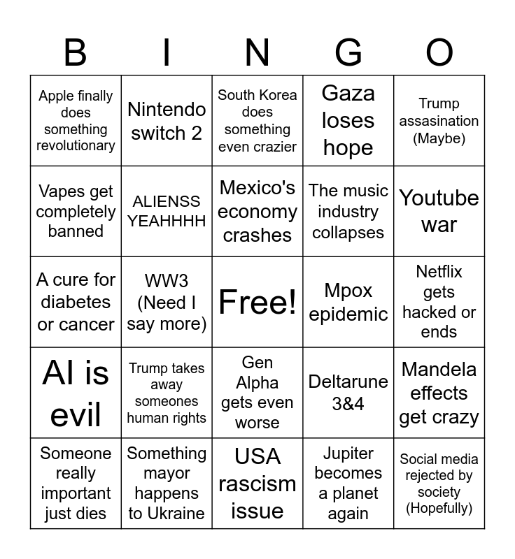 This bingo card has a free space and 24 words: Trump takes away someones human rights, Something mayor happens to Ukraine, Mexico's economy crashes, Someone really important just dies, Trump assasination (Maybe), Apple finally does something revolutionary, Vapes get completely banned, Nintendo switch 2, Mpox epidemic, Gen Alpha gets even worse, The music industry collapses, A cure for diabetes or cancer, Deltarune 3&4, Mandela effects get crazy, ALIENSS YEAHHHH, Jupiter becomes a planet again, Netflix gets hacked or ends, South Korea does something even crazier, Youtube war, WW3 (Need I say more), Social media rejected by society (Hopefully), AI is evil, Gaza loses hope and USA rascism issue.