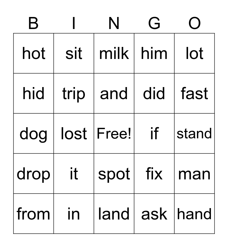 This bingo card has a free space and 29 words: from, soft, lost, stop, hot, milk, trip, it, if, in, stand, hand, land, ask, fast, past, spot, drop, lot, dog, fix, six, did, hid, him, sit, man, and and not.