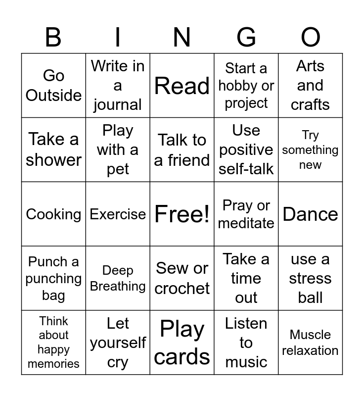 This bingo card has a free space and 24 words: Deep Breathing, Let yourself cry, Talk to a friend, Think about happy memories, Arts and crafts, Go Outside, Take a shower, Write in a journal, Pray or meditate, Sew or crochet, Use positive self-talk, Cooking, Take a time out, use a stress ball, Play with a pet, Listen to music, Dance, Read, Try something new, Exercise, Muscle relaxation, Punch a punching bag, Start a hobby or project and Play cards.