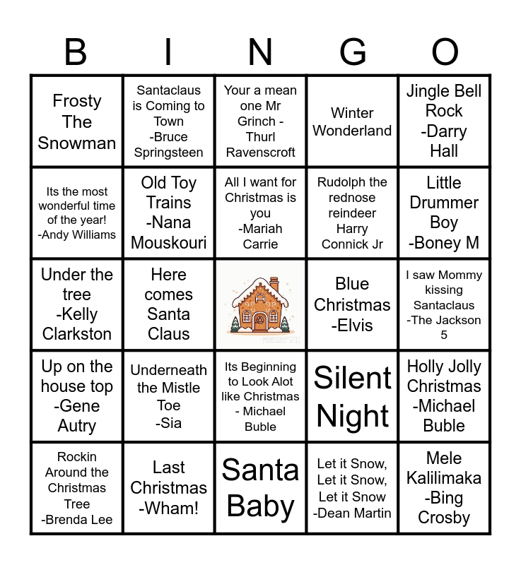 This bingo card has a free space and 26 words: Its Beginning to Look Alot like Christmas - Michael Buble, Let it Snow, Let it Snow, Let it Snow -Dean Martin, All I want for Christmas is you -Mariah Carrie, Last Christmas -Wham!, Jingle Bell Rock -Darry Hall, Frosty The Snowman, Its the most wonderful time of the year! -Andy Williams, Santaclaus is Coming to Town -Bruce Springsteen, I saw Mommy kissing Santaclaus -The Jackson 5, Silent Night, Rudolph the rednose reindeer Harry Connick Jr, Under the tree -Kelly Clarkston, Holly Jolly Christmas -Michael Buble, Rockin Around the Christmas Tree -Brenda Lee, Here comes Santa Claus, Baby its cold outside, Winter Wonderland, Up on the house top -Gene Autry, Your a mean one Mr Grinch - Thurl Ravenscroft, Mele Kalilimaka -Bing Crosby, Little Drummer Boy -Boney M, Santa Baby, Blue Christmas -Elvis, Underneath the Mistle Toe -Sia, Old Toy Trains -Nana Mouskouri and One More sleep til Christmas.