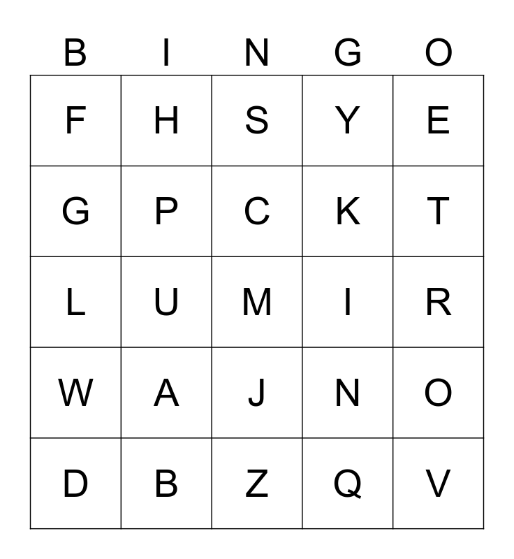 This bingo card has a free space and 24 words: A, B, C, D, E, F, G, H, I, J, K, L, N, O, P, Q, R, S, T, U, V, W, Y and Z.