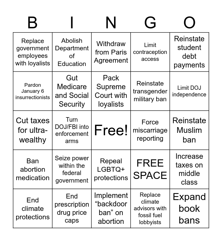This bingo card has a free space and 25 words: Seize power within the federal government, Implement “backdoor ban” on abortion, Pack Supreme Court with loyalists, End climate protections, Reinstate student debt payments, Replace government employees with loyalists, Pardon January 6 insurrectionists, Abolish Department of Education, Force miscarriage reporting, Repeal LGBTQ+ protections, Reinstate transgender military ban, Cut taxes for ultra-wealthy, FREE SPACE, Increase taxes on middle class, Gut Medicare and Social Security, Eliminate worker protections, Reinstate Muslim ban, Withdraw from Paris Agreement, Limit DOJ independence, Turn DOJ/FBI into enforcement arms, Expand book bans, End prescription drug price caps, Ban abortion medication, Limit contraception access and Replace climate advisors with fossil fuel lobbyists.