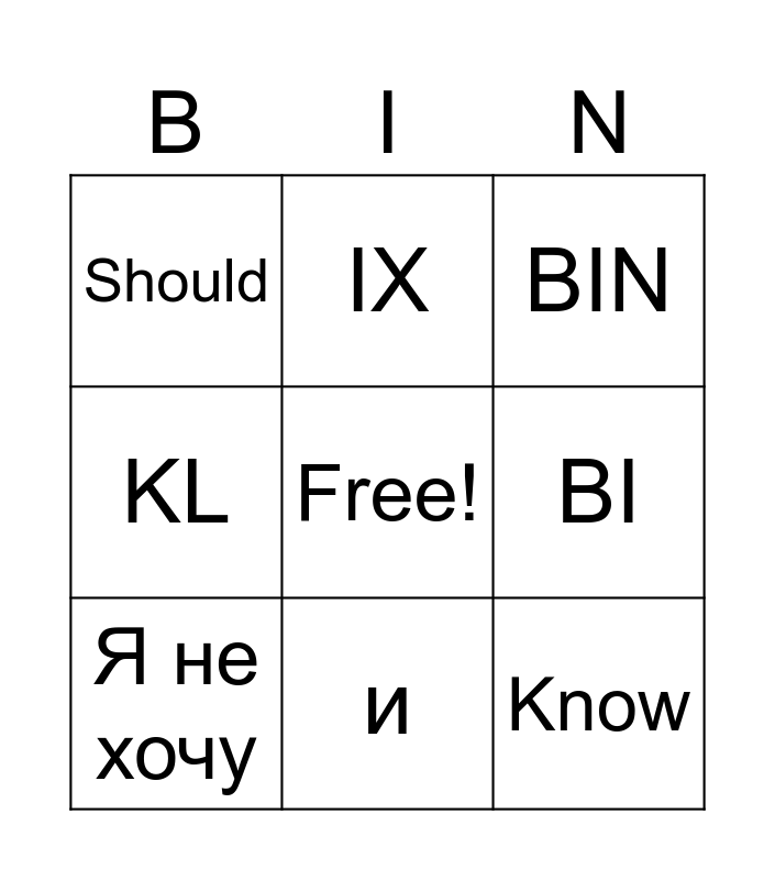 This bingo card has a free space and 27 words: B, BI, BIN, BING, BI, BIN, IX, UCK, TR, ST, Free!, KL, M, Absolutely, Not, Нет, Я не хочу, и, Why, Should, I, Even, Try, If, I Already, Know and The outcome.