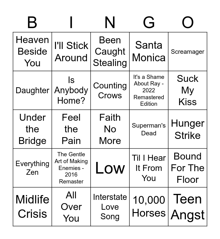 This bingo card has 89 words: Bullet With Butterfly Wings, The Distance, Low, Fell On Black Days, Only Happy When It Rains, Say It Ain't So, Mrs. Robinson, Machinehead, In the Meantime, High and Dry, Sliver, Nirvana, Bound For The Floor, Hunger Strike, Mr. Jones, Counting Crows, The Way, Never There, CAKE, Lump, Cherub Rock, Cannonball, Interstate Love Song, Stone Temple Pilots, Under the Bridge, All Over You, Lightning Crashes, Live, Take A Picture, Filter, Santa Monica, Feel the Pain, Peaches, Heaven Beside You, Beautiful Disaster, Been Caught Stealing, Daughter, Backwater, Suck My Kiss, Midlife Crisis, Everything Zen, Follow You Down, Everything To Everyone, Sunburn, Til I Hear It From You, Superman's Dead, Clumsy, Pretend We're Dead, This Is a Call, I'll Stick Around, Trippin' on a Hole in a Paper Heart, Who Was In My Room Last Night?, My Name Is Jonas, Shitlist, She Don't Use Jelly, Tones Of Home, Saint Joe On The School Bus, High, My Song, Somebody to Shove, Tyler, Into Your Arms, Girl from Mars, I'm Above, Allison Road, Pink Triangle, All The Kids Are Right, Cruel to Be Kind, Tahitian Moon, The Gentle Art of Making Enemies - 2016 Remaster, Faith No More, Heroin Girl, Everclear, It's a Shame About Ray - 2022 Remastered Edition, Is Anybody Home?, 10,000 Horses, Eddie Vedder, Start Choppin, Dinosaur Jr., Teen Angst, Screamager, Cough Syrup, Wax Ecstatic, Homebrew, Do You Right, Piranha, Naveed, Andres and Volcano.