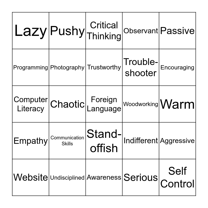 This bingo card has 85 words: Public Speaking, Self Management, Critical Thinking, Decision Making, Math, Research, Sloppy, Accounting, Graphics, Music, Art, Drawing, Photography, Woodworking, Video Creation, Lazy, Website, Programming, Articulate, Creativity, Innovation, Trouble-shooter, Foreign Language, Academics, Chaotic, Planning, Leadership, Listening, Reading, Initiative, Communication Skills, Sales, Problem Solving, Computer Literacy, Self Control, Adaptability, Awareness, Integrity / Honesty, Empathy, Encouraging, Positiveness, Ability to focus, Blunt, Ability to handle Change, Conflict Resolution, Forceful, Fearful, Enthusiastic, Obstructive, Spontaneous, Pushy, Trustworthy, Loose-tongued, Respectful, Mistrustful, Tolerant, Undisciplined, Observant, Optimistic, Rude, Caring, Contemptuous, Generous, Short-sighted, Practical, Passive, Considerate, Aggressive, Self-assured, Bossy, Inspiring, Adventurous, Cynical, Lively, Persuasive, Stand-offish, Serious, Vague, Idealistic, Inflexible, Warm, Moody, Humorous, Indifferent and Friendly.
